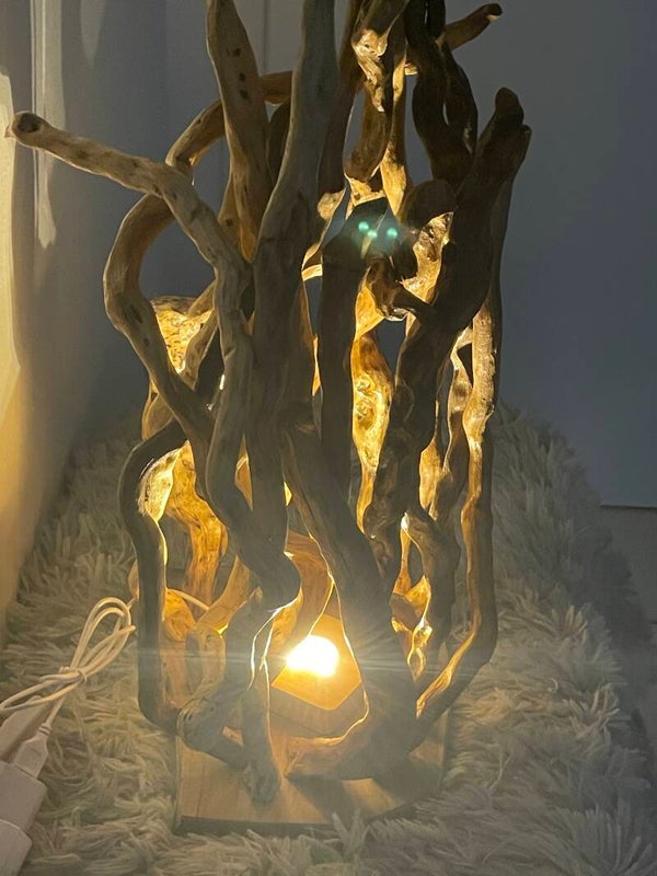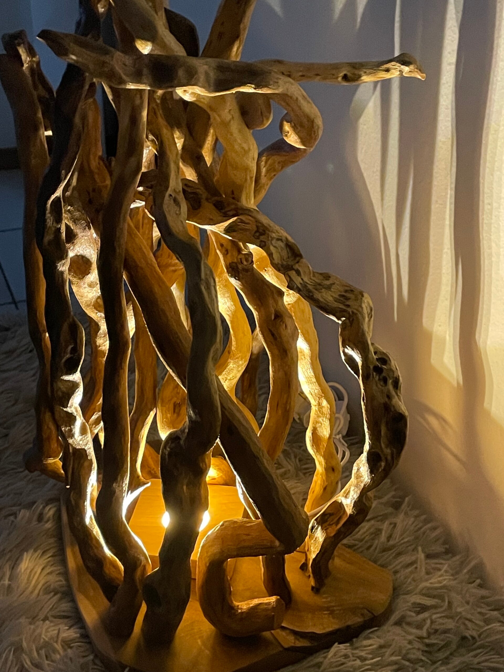 Handgefertigte einzigartige Lampe mit schön verdrehten Wurzeln auf Teakholzplatte in Seidenmatt lackiert. Der Unterboden ist mit Filz versehen. Die Lampenfassung ist mit integriertem LED Licht, On/Off Schalter und Stecker/USB kompatibel. Diese Lampe zaubert eine wohlige Atmosphäre. Die Höhe beträgt 50cm/ Breite 23cm/ Tiefe 22cm