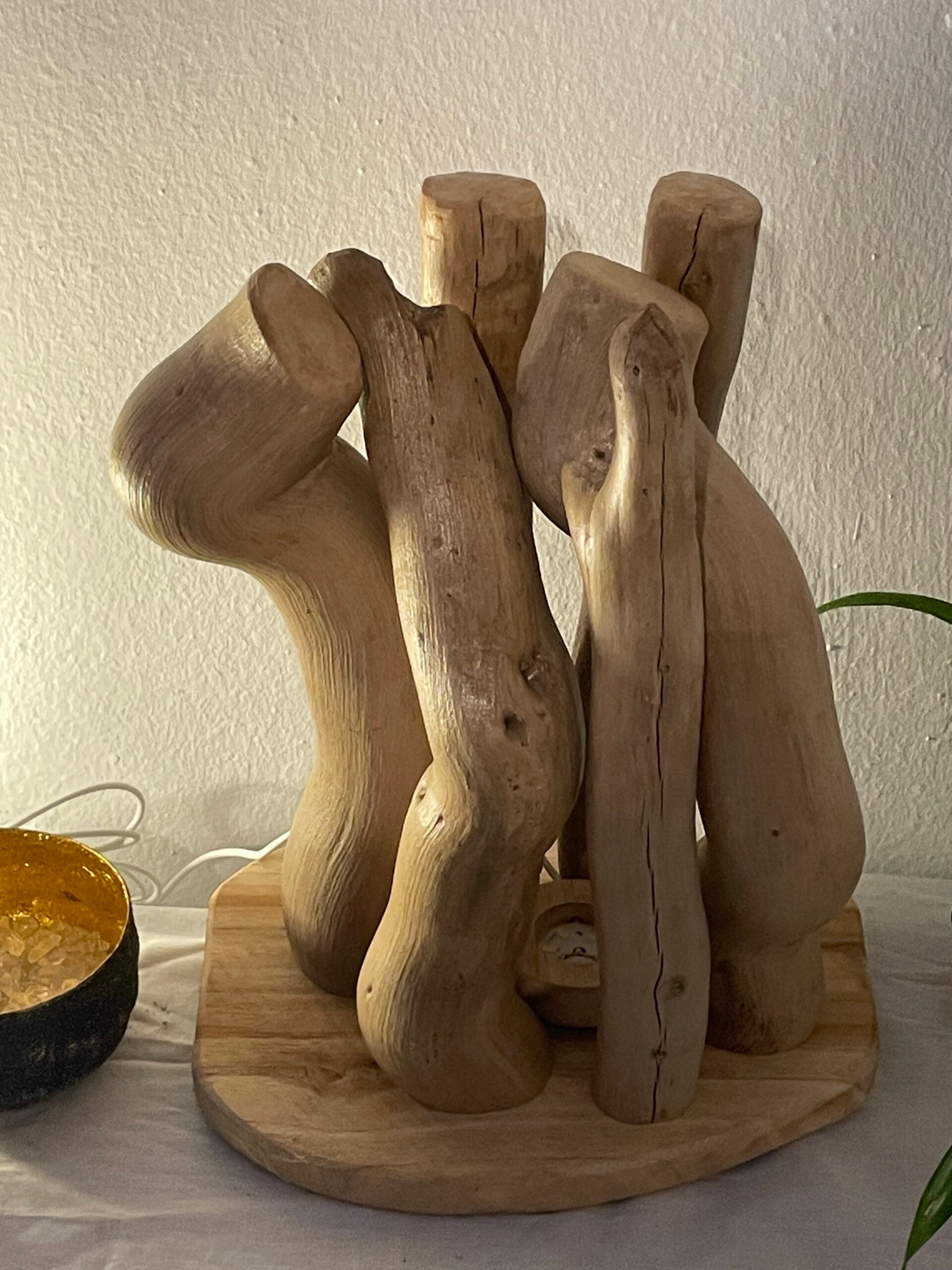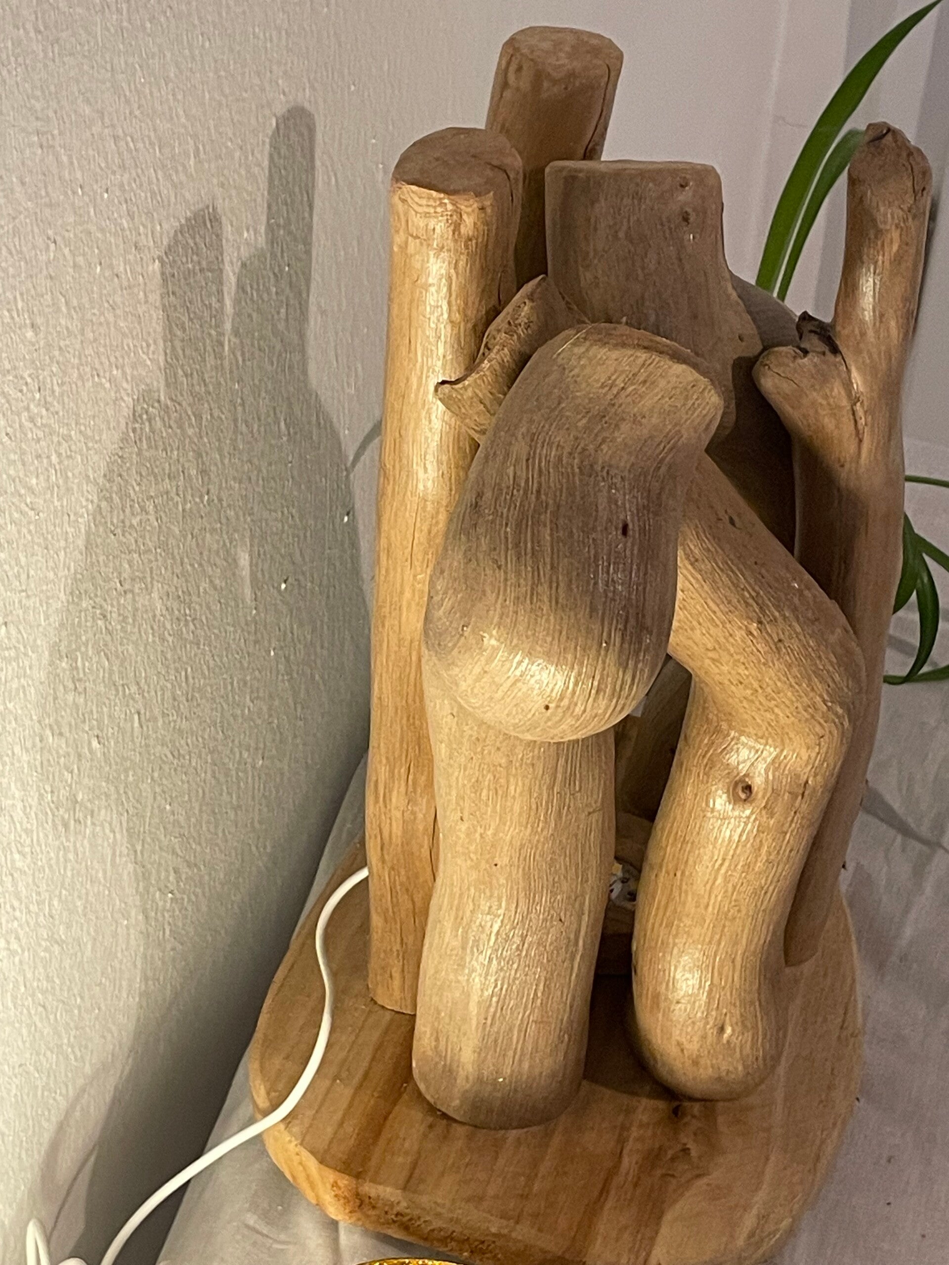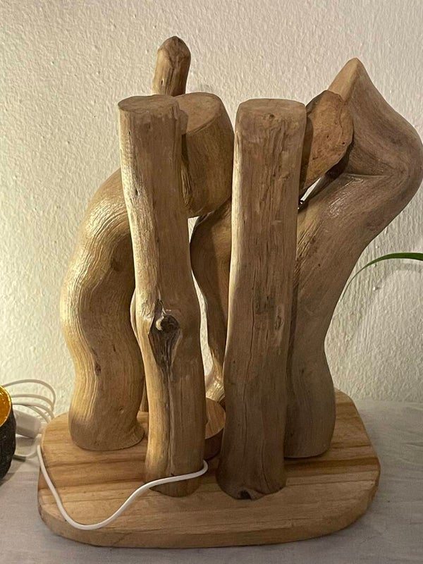 wunderschöne natürliche Wurzelholzlampe. Die Lampe ist matt lackiert und enthält eine LED Lampenfassung mit On/Off Schalter auf Teakholzplatte. Auf der Unterseite befindet sich Fließstoff. Holen Sie sich die Natur in ihr Zuhause.Höhe 34 cm/ Breite 25/ Tiefe 18 cm